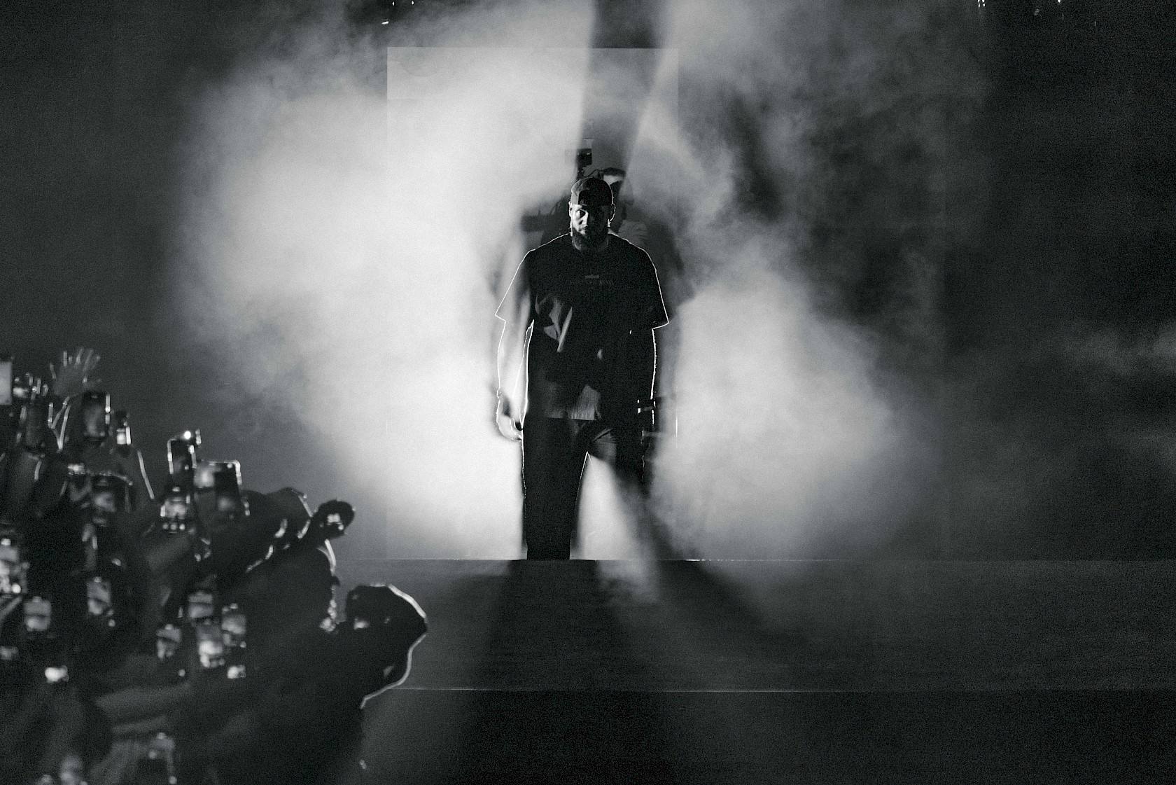The plaza was transformed into an outdoor arena for 500 fans and media, anchored by a monumental crown pavilion in the central courtyard where LeBron revealed the XXIII. Surrounding facades were animated with large-scale visuals and a custom exterior lighting scheme that extended into the plaza.