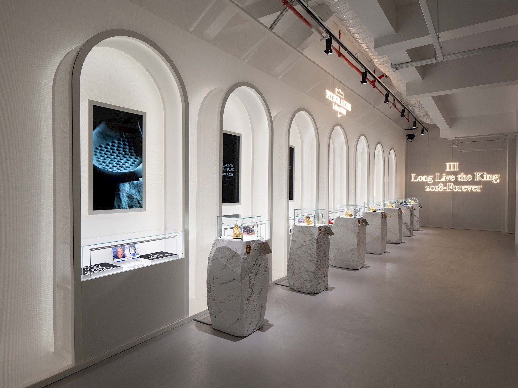 The accompanying exhibition spanned four floors of the complex, each dedicated to a period of LeBron’s career. Shifts in material and lighting signalled changes in era — expressed through scaffolding, scrim walls, brushed aluminium and stone. On the ground floor, mobile archive cabinets presented Nike ephemera, while stone plinths evolved from rough forms to refined monoliths, echoing LeBron’s progression from prodigy to icon. A scaffolding system threaded through the building, transforming the raw structure with minimal intervention, creating zones of dark and light, and supporting digital screens, interpretation panels and neon graphics.