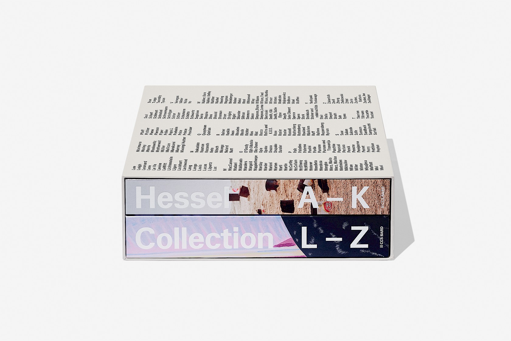 The design builds on the content organisation of encyclopedias and features a distinctive step index. The catalogue consists of two volumes and divides the artists and collectives into the groups A-K and L-Z. The title Hessel Collection is foil blocked in two parts on the spines, leaving the front and back covers entirely to works by Gabriel Orozoco, Gerhard Richter, Toyin Ojih Odutola and Karlheinz Weinberger. The waxed cloth slipcase features a tight screen printed list of the 438 names from Abakanowicz to Zwillinger.