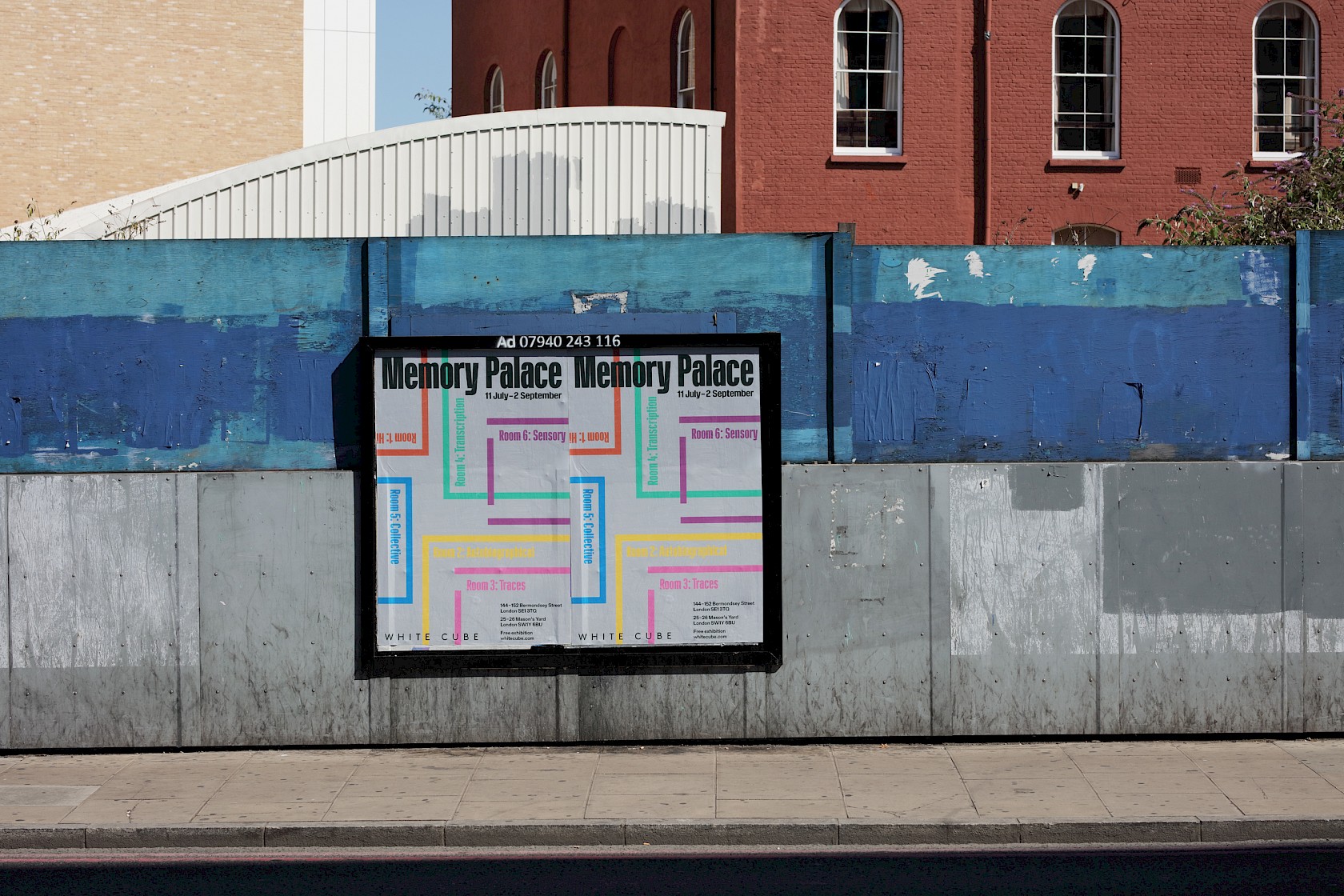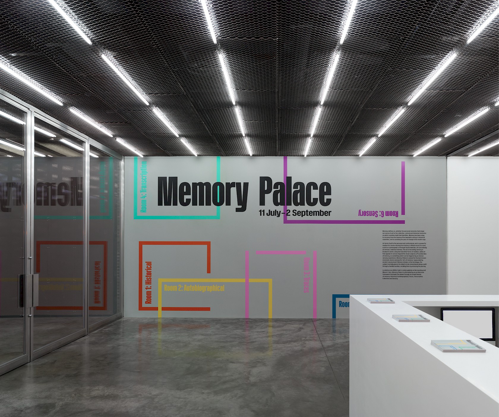 We designed the identity, campaign, printed matter and exhibition graphics for Memory Palace at White Cube, a group exhibition showcasing over 90 recent works by more than 40 artists in celebration of the gallery’s 25th anniversary. Spread across both London galleries, works were grouped into six rooms focusing on different aspects of memory—Historical, Autobiographical, Traces, Transcription, Collective and Sensory. Our identity distilled the floorplan—and mnemonic strategy—of Memory Palace into a series of colour-coded rooms, used to form unique compositions across a wide range of applications.