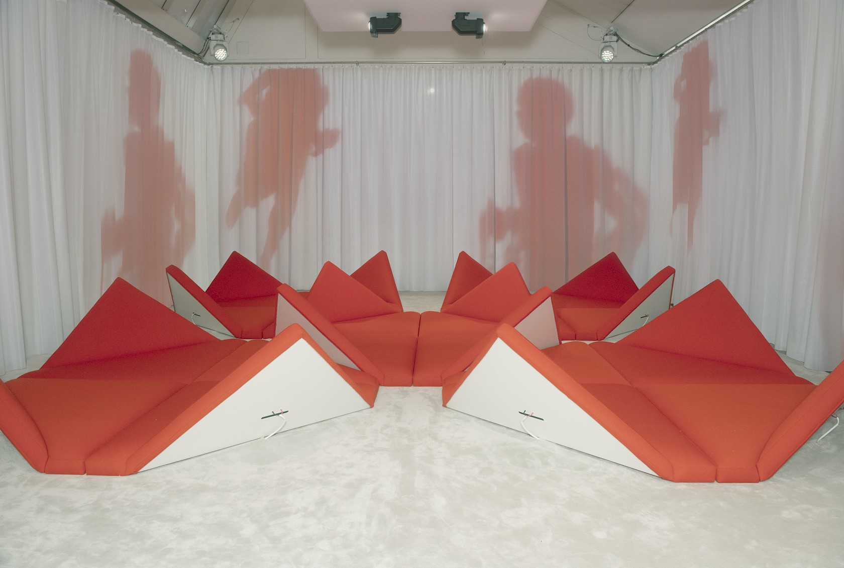 The spatial design introduced a series of modular display panels that referenced the faceted shape of Paulin’s iconic Tapis-Siège, while custom light towers featured pulsing, vertically stacked LEDs — corresponding to a runner’s heartbeat. An abstracted running track guided visitors through the site to the exhibition’s central room: Paulin’s previously unreleased project Video Barnum (1985).