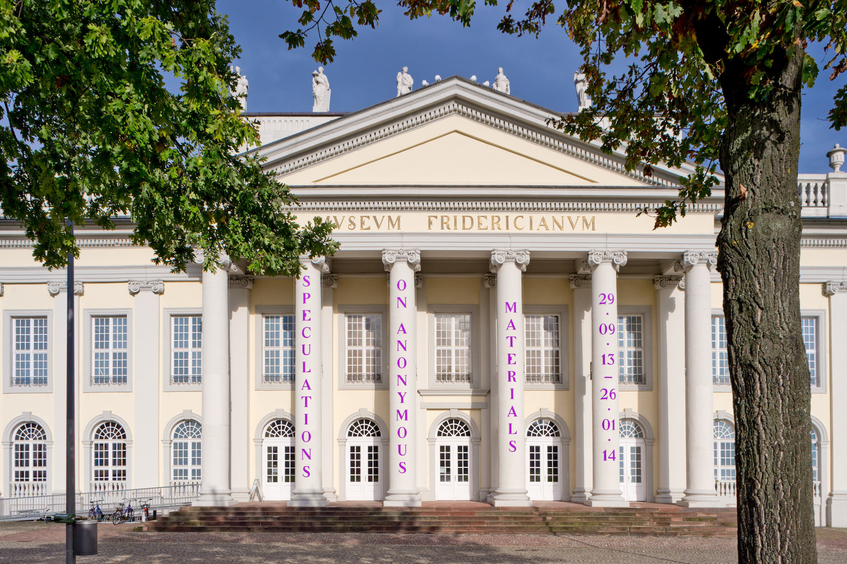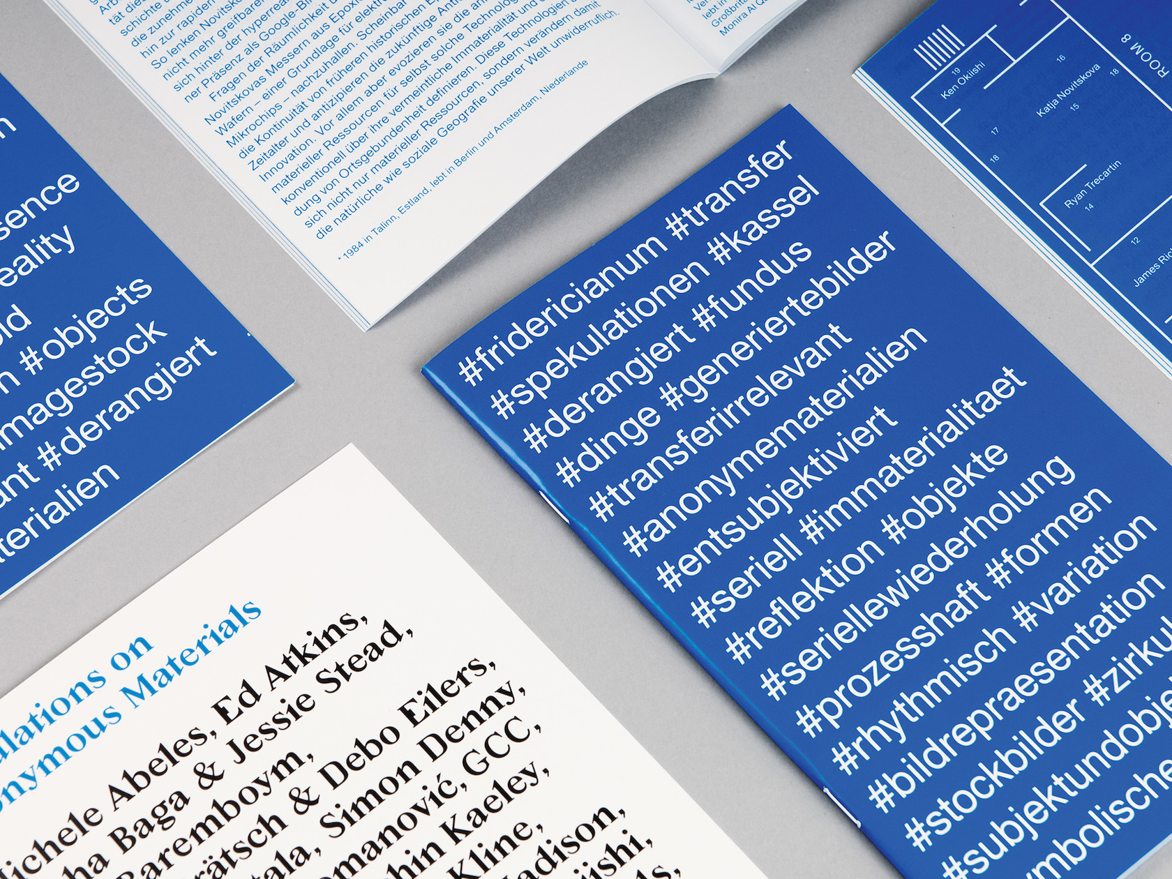 As part of our art direction for Fridericianum (2013-16), we created unique materials for each of the museum’s exhibitions during the tenure of director Susanne Pfeffer. The first of these exhibitions was Speculations on Anonymous Materials, curated by Pfeffer in the autumn of 2013. The exhibition presented the work of artists whose approach to abstraction is informed by the contemporary conditions of visual culture in terms of originality, repetition, networked relationships and virtual mediums. Our design for the exhibition integrated conceptual metadata with German and English keywords prefaced by the now omnipresent hashtag symbol. The use of these keywords in combination with bright chroma key blue were adapted for postcards, an exhibition guide and the foyer space.